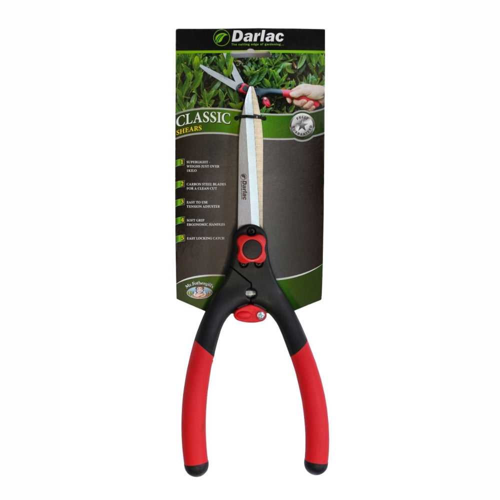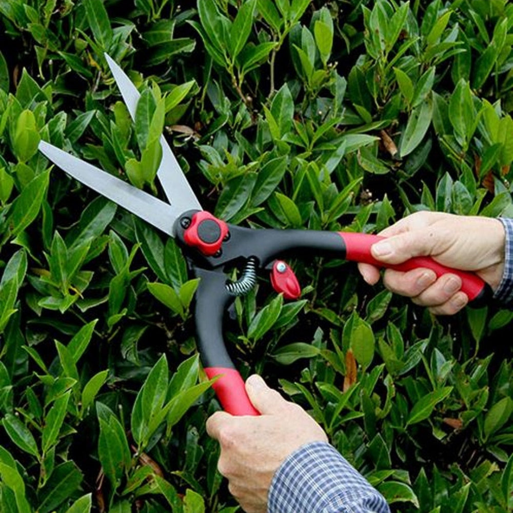 This is a very popular shear, comfortable in use and suitable for grass and hedge trimming. Ergonomic, with slightly raised handles, high carbon steel blades and comfortable grips. Wonderfully light - weighs just 554 grams. Includes a tension adjuster and easy locking mechanism.