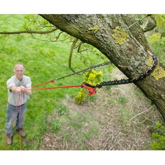 For high growth throw the weighted rope over the limb first and pull up the chainsaw. The "Trueguide" will automatically place the teeth onto the branch at the correct cutting position. Using both ropes saw, as previous. For root pruning the bare minimum of excavation is necessary. Only sufficient access for the blade to pass under the root is required. Can also be used for prepared timber.