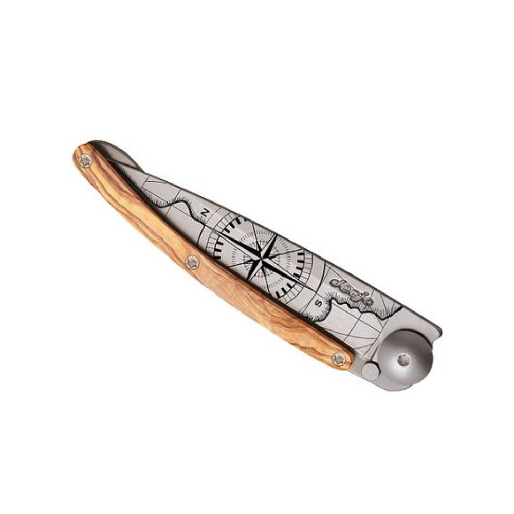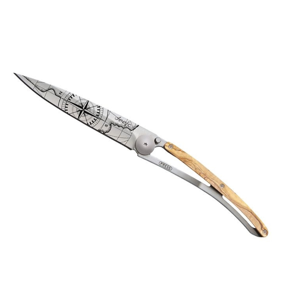 Ultra-light knife in Z40C13 stainless steel, matt finish. Secure liner lock system decorated with fine laser engraving. Belt clip. Solid olive wood handle. Olive wood, known for its robustness and antibacterial qualities is a classic of cutlery. Widely acclaimed by its admirers for the beauty of its natural veins, each piece is unique according to the tree from which it was crafted, illuminating your Deejo with superb arabesques of beige, without fear of moisture or time.