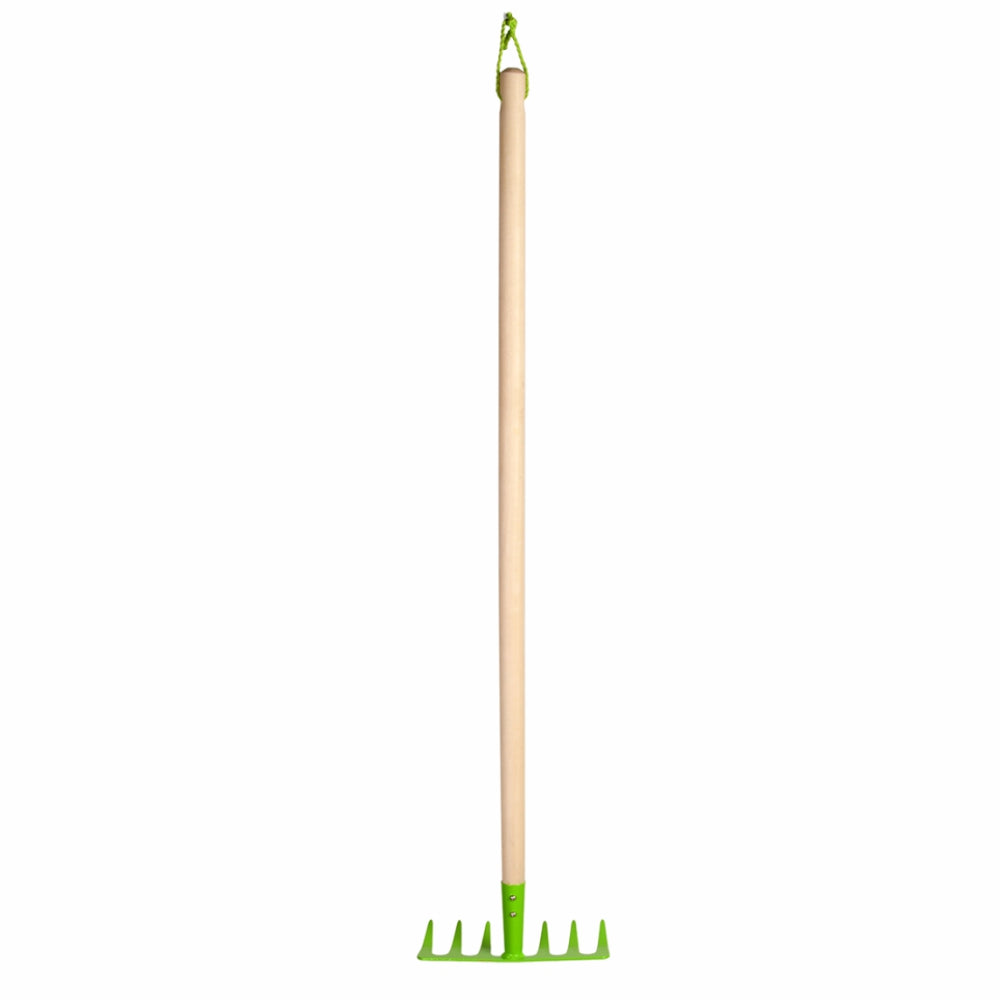 The wooden handle of the rake ensures an easy grip for children, and is made from FSC 100% wood, ensuring it is eco-friendly and sustainably sourced. When not in use, the rake features a convenient hanging loop for easy storage, making it easy for your little ones to keep their gardening tools organized and ready for use.