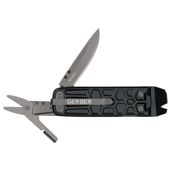 - Tools include a 2.5” plain edge blade, spring-loaded scissors, cast pry bar, bottle opener, and more.