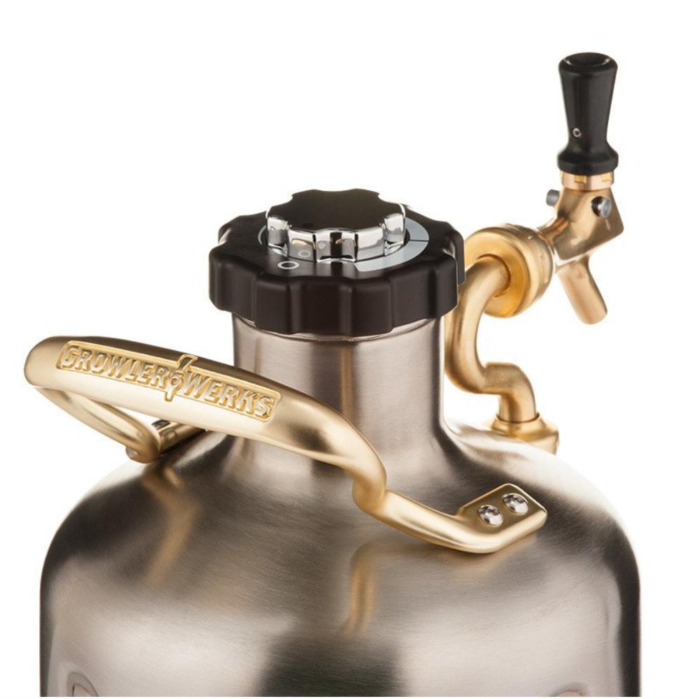 On the go or at home, this GrowlerWerks uKeg is Durable, double-wall vacuum insulated Stainless Steel. CO2 regulator cap with customisable tap handle and gauge. Brass carrying handle.