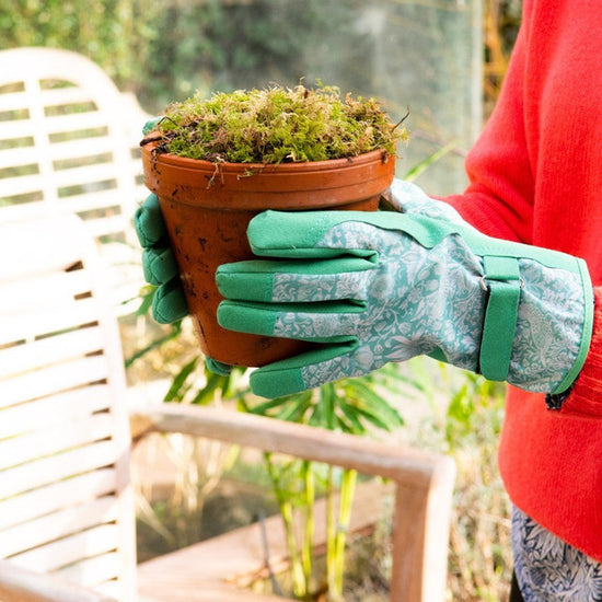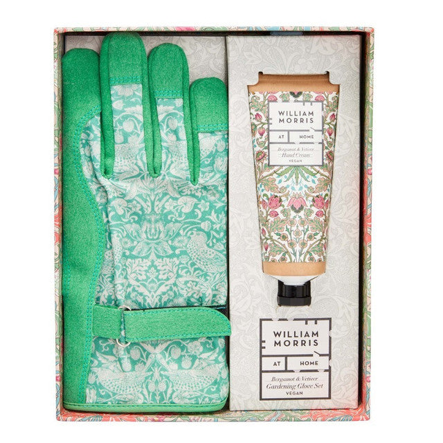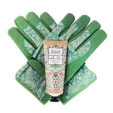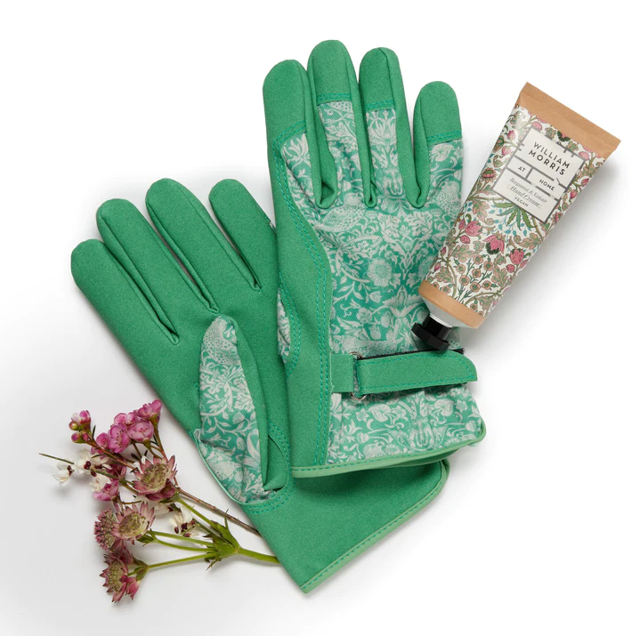 A useful and beautiful gift for gardeners of adjustable lightweight gardening gloves with the Strawberry Thief design, and shea butter enriched Bergamot & Vetiver hand cream. Self-care, practicality and design working together, hand in glove.