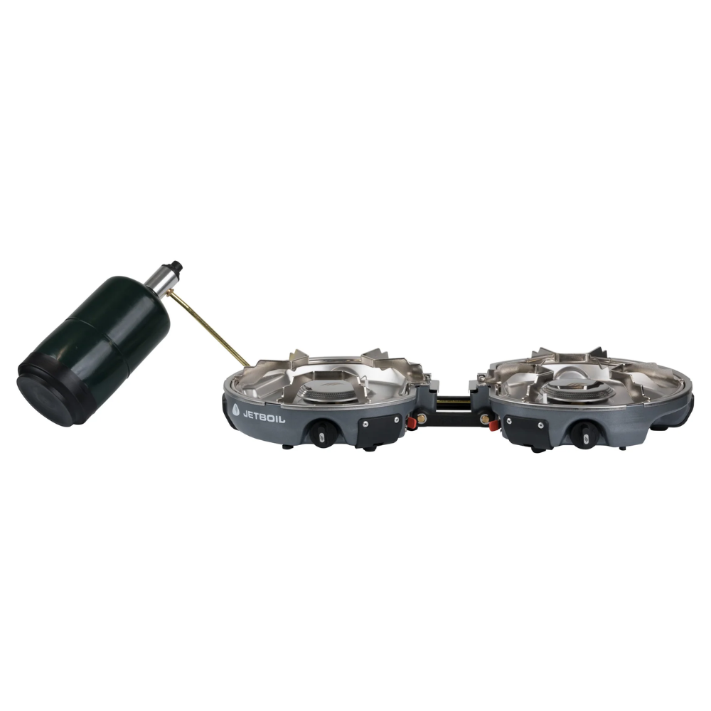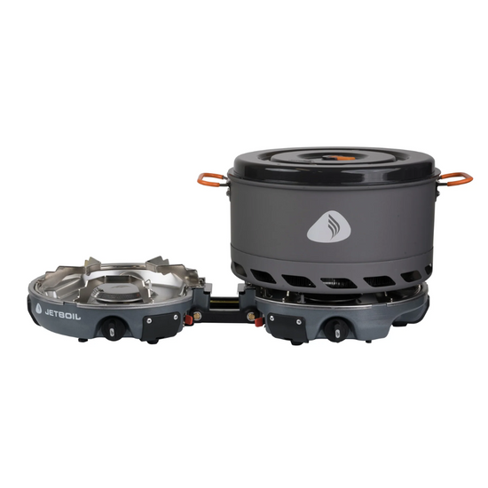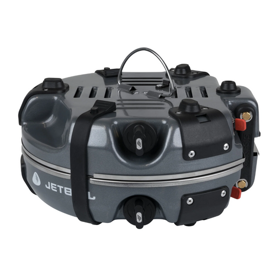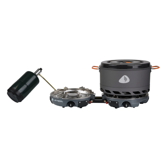 The Genesis Basecamp System is the ultimate all-in-one outback cooking system, stowing neatly into itself and fitting snugly among your gear. The system's 5-liter Jetboil FluxPot and 10-inch ceramic-coated nonstick fry pan give you everything you need to set a new benchmark for basecamp cooking. A beastly 10,000 BTU heating system boils water in just over three minutes. An attachable windscreen improves the system's performance in any weather; regulated for consistent performance down to -6 degrees C. Includes system carrying bag with pocket for regulator fuel connection; compatible with standard 16.4-ounce propane bottle; weighs 4.1 kg.