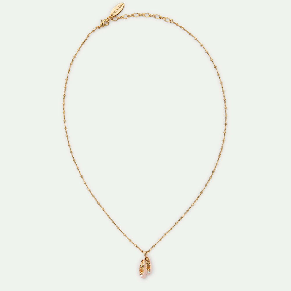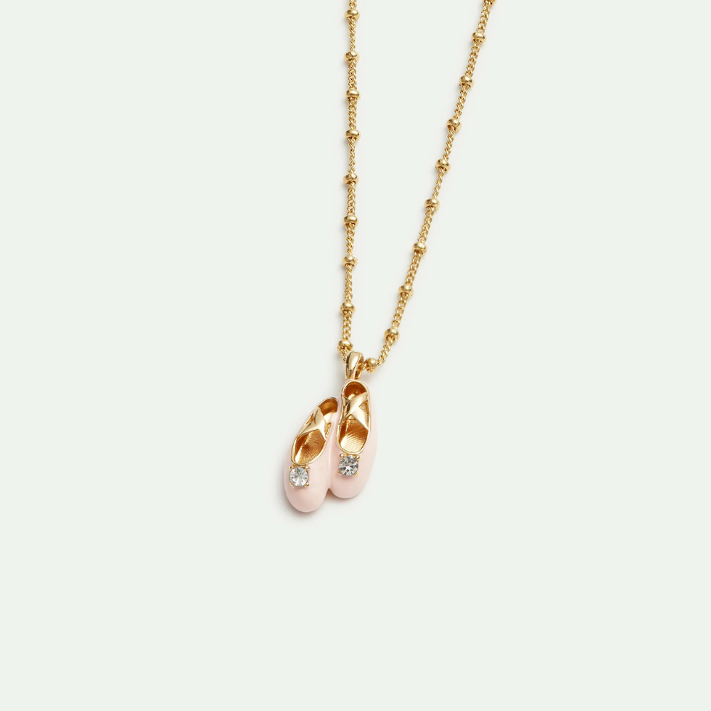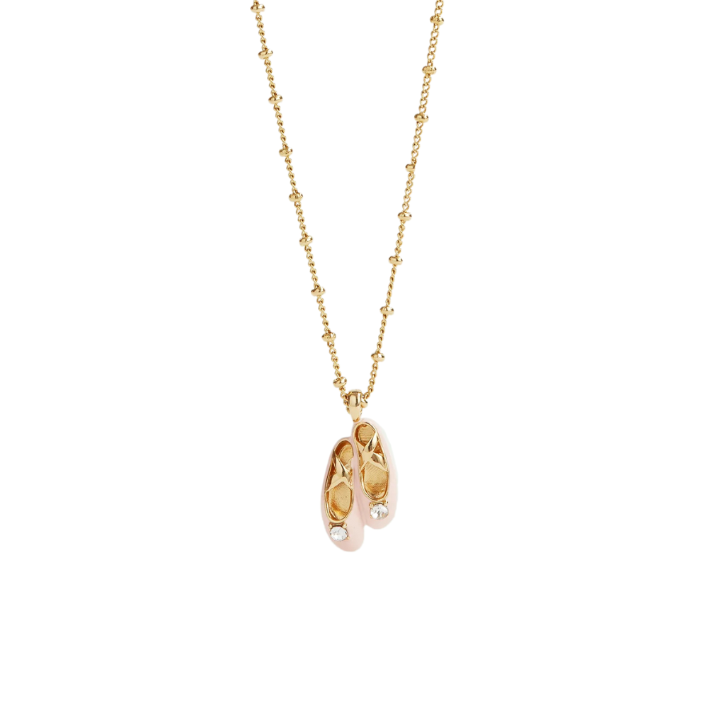 Hand-enamelled pink ballet slippers pendant necklace, gold-plated brass beaded chain. To celebrate the 150th anniversary of the Palais Garnier, Les Néréides has designed a collection of jewellery infused with the very spirit of the Opera.
