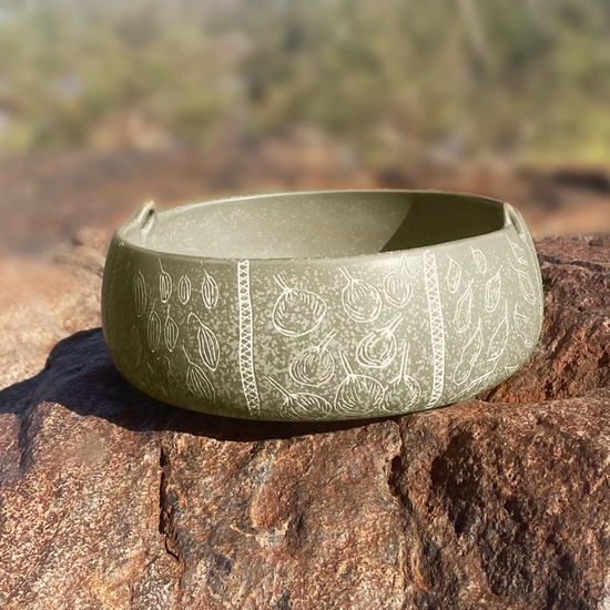 A celebration of culture, language, and pottery; the story of the Yindijbarndi people of the north-western Pilbara region of Western Australia. Jane Cheedy is a respected Yindijbarndi Elder, cultural custodian, linguist, and artist. Jane is dedicated to preserving and sharing the Yindijbarndi language, and has work for many years as a Yindijbarndi language teacher at both high and primary school levels. Jane's artwork often features written Yindijbarndi text, oral recordings of songs, and depictions of the Yindijbarndi plants, animals and important sites.
