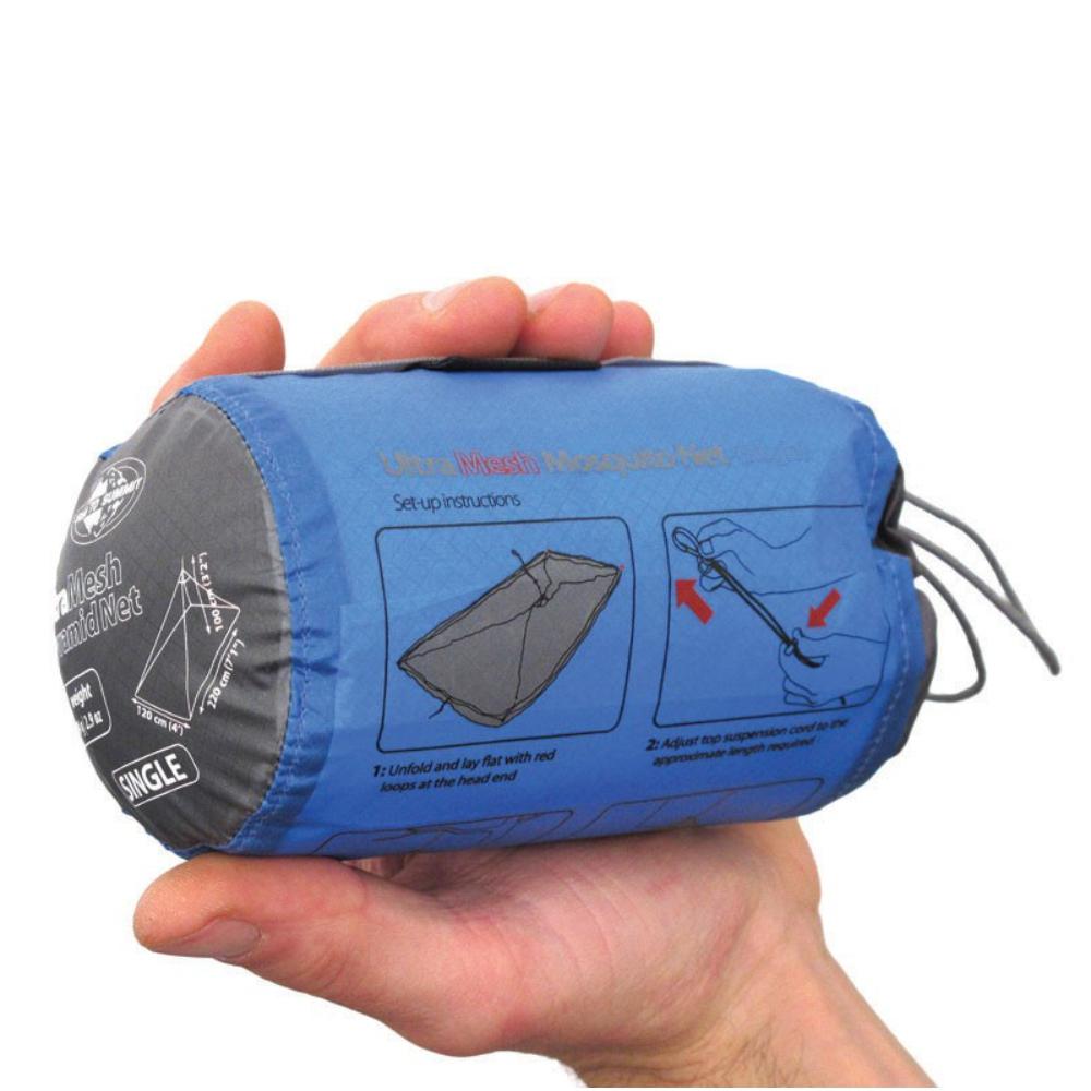 The asymetric design means the apex of the pyramid is nearer to the head end for more usable head room. Colored tapes at each corner and a single suspension point ensure easy set up. Half the bulk of our standard pyramid nets, the Nano Mosquito nets use an elasticised hanging cord and draw cord hem to keep it tucked under your mattress.