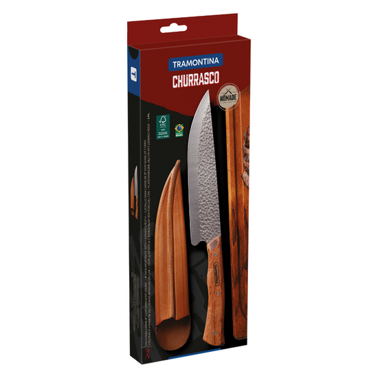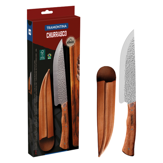 The Tramontina Nômade 8-inch meat knife with stainless-steel blade, wood handle and leather sheath is a perfect combination of rustic style and tradition. Created with a high-quality stainless-steel blade and wood handle, it is perfect for offering the precision needed for cutting meat easily and also provides a comfortable touch during handling, ensuring safety and firmness when cutting. It comes with a leather sheath for perfect storage, consequently protecting it and always keeping it in perfect condition for use. Whether you are passionate about barbecue or an experienced cook, the Tramontina Nômade meat knife is indispensable for precise and delicious cutting!