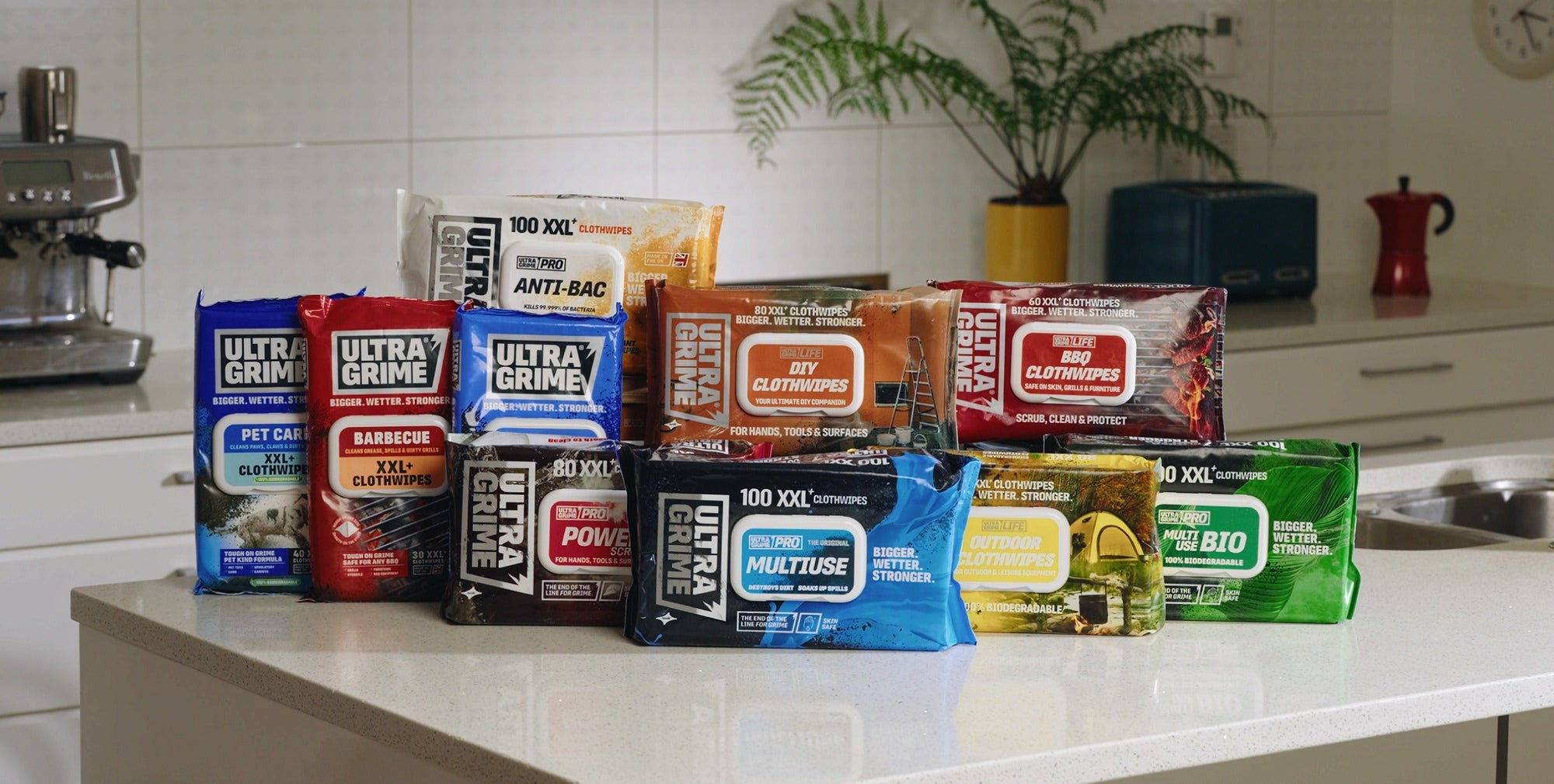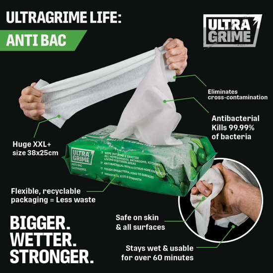 UltraGrime XXL Clothwipes are huge cleaning cloths that are bigger, wetter and stronger than any other wipe. Double the size of standard wipes, they allow you to clean up everyday messes quickly and easily, with just one wipe. They’ll stay wet for over an hour out of the pack and the thick, strong fabric means you can really clean the toughest grime from all surfaces.