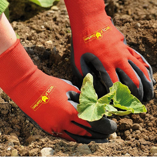 These comfortable, snug-fitting WOLF-Garten® Garden Bed Gloves are especially suitable for soil cultivation, damp conditions and work where finger sensitivity is required for setting out small seedlings. The palm, fingertips, and thumb are waterproof so hands stay dry.